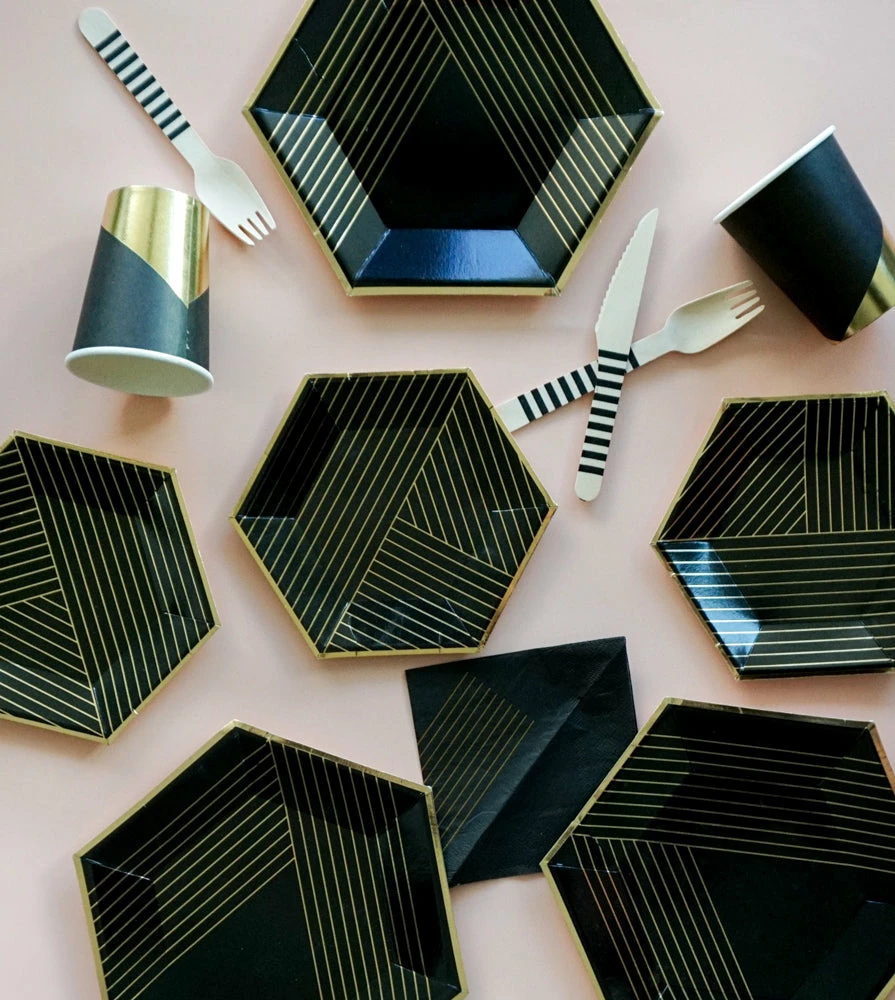These set has gold geometric arrow patterns on a black background trimmed with a gold border. This set is perfect for a Gatsby-themed, Corporate, Mens Party, Halloween dinner party or kids costume party.