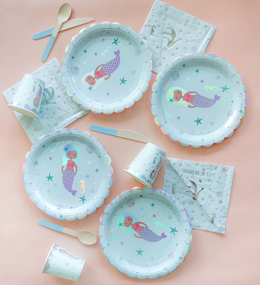 These adorable shimmer mermaid birthday tableware are perfect for decorating a baby shower, mermaid or under the sea themed party.