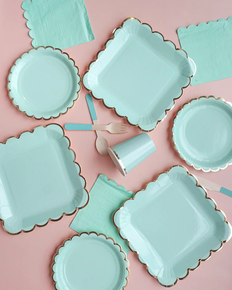 These stunning square plates, in all the colors of the pastel family with a stylish shiny gold foil border and finer details, will look amazing on the table. Perfect for any occasion with the same colour scheme, baby showers, birthdays, kids parties, and more.
