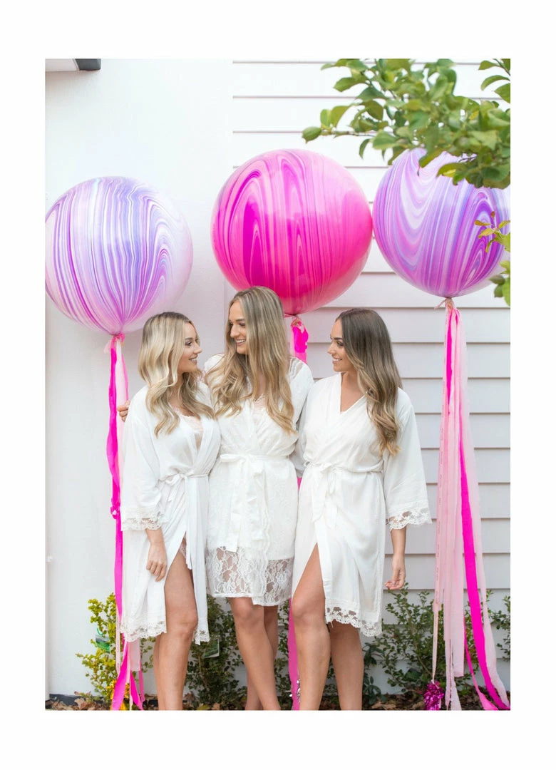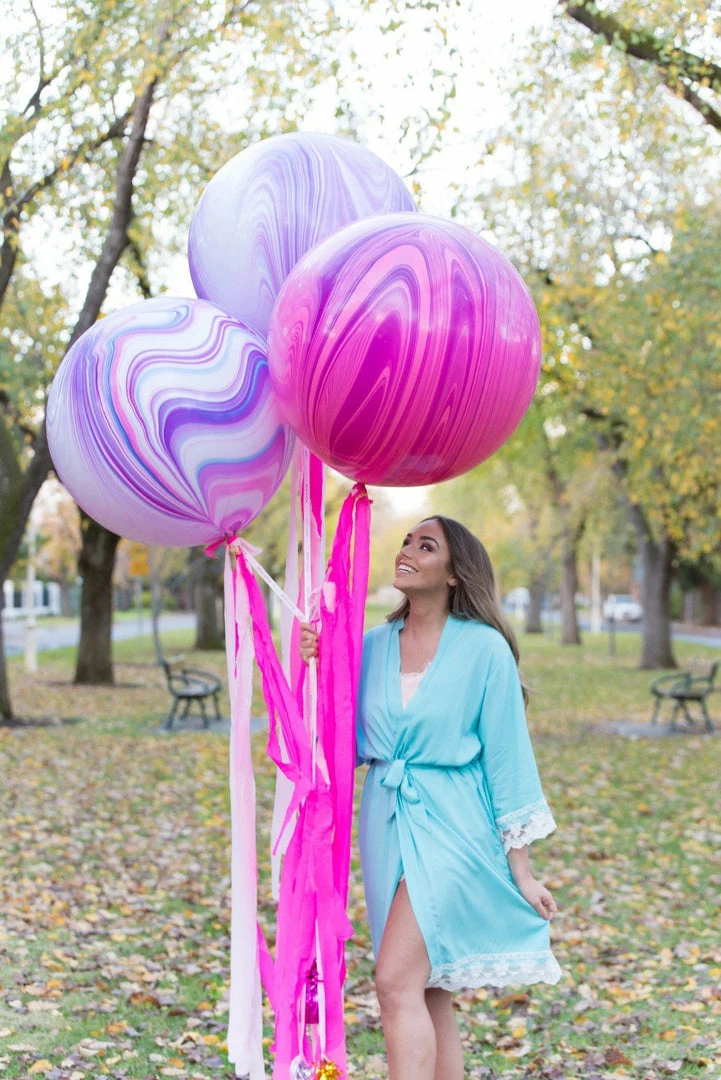 Brighten up your event with our Supersized Rainbow Balloon. Each marble balloon is unique and swirled with either a blend of pink, purple and/or aqua! Our Rainbow Balloons are made by dipping Clear balloons in multi-coloured latex, giving each balloon a unique marbled pattern. As a featured option, you can add a beautiful personalised font to your balloons to either express a message at your event or send as a gift to that someone special! Included with this product is a classic balloon weight, a ribbon bow, our signature ribbon and streamers/ribbons to add that finishing fun touch!