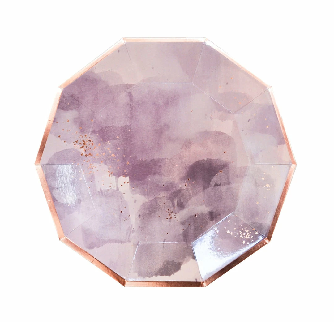 With layers of beautiful lavender watercolor and rose gold sparkles, our large decagon paper plates make an everlasting impression at birthdays, christenings and weddings.