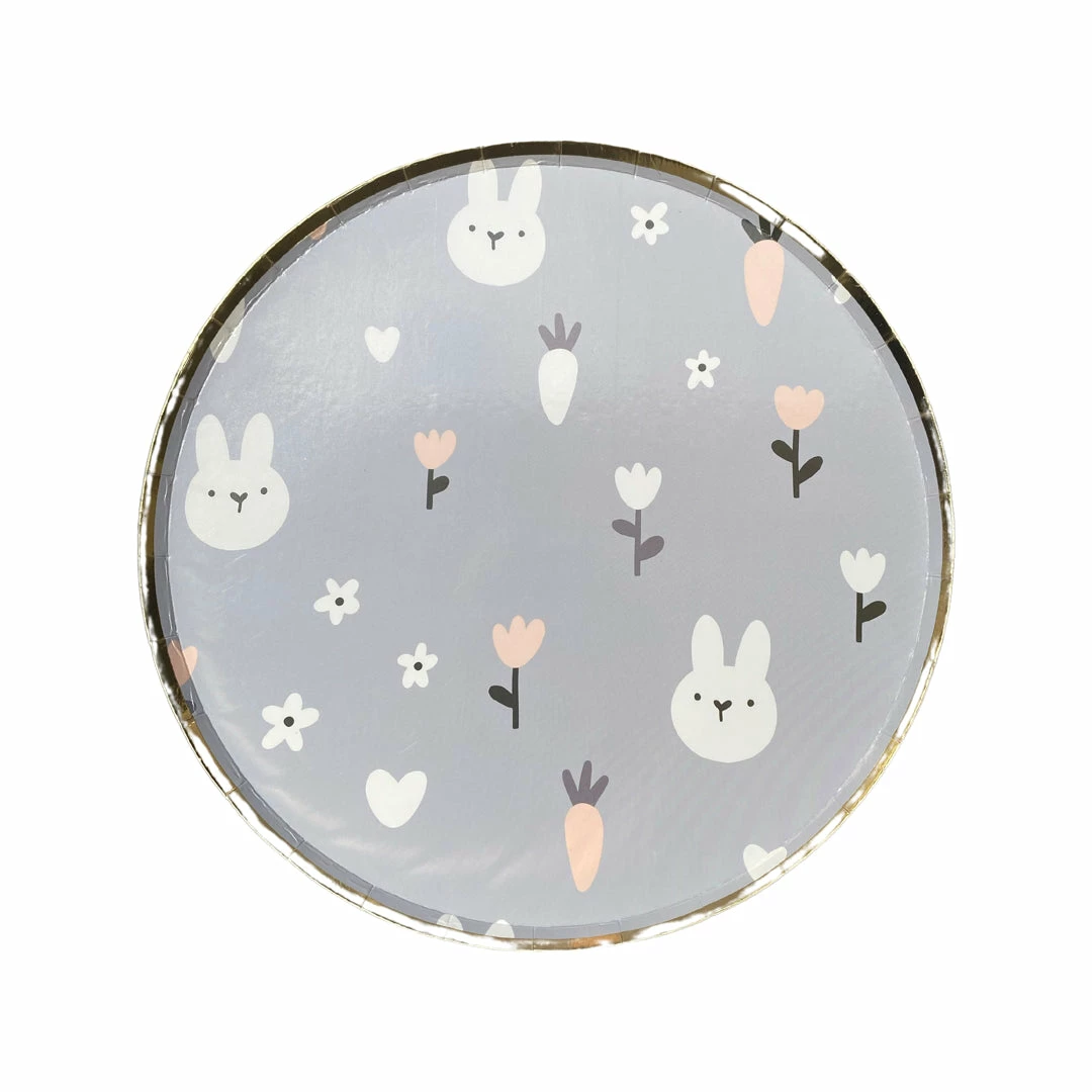 Our Dusty Bunny Blue paper plates are perfect for Easter with this adorable bunny design. These paper plates are embellished with shiny gold foil around the edge of the plate. Â