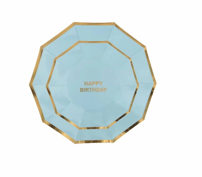 This simple but elegant design is great for birthday parties. These paper plates are embellished with gold foil around the edge of the plate to really make it pop. this design is also available in a variety of different colours such as Green, White, Yellow and Blue.